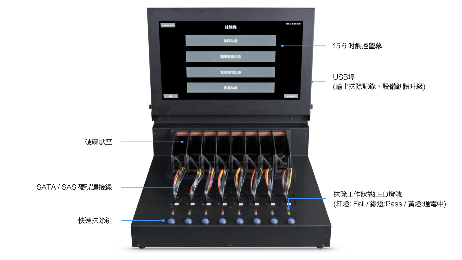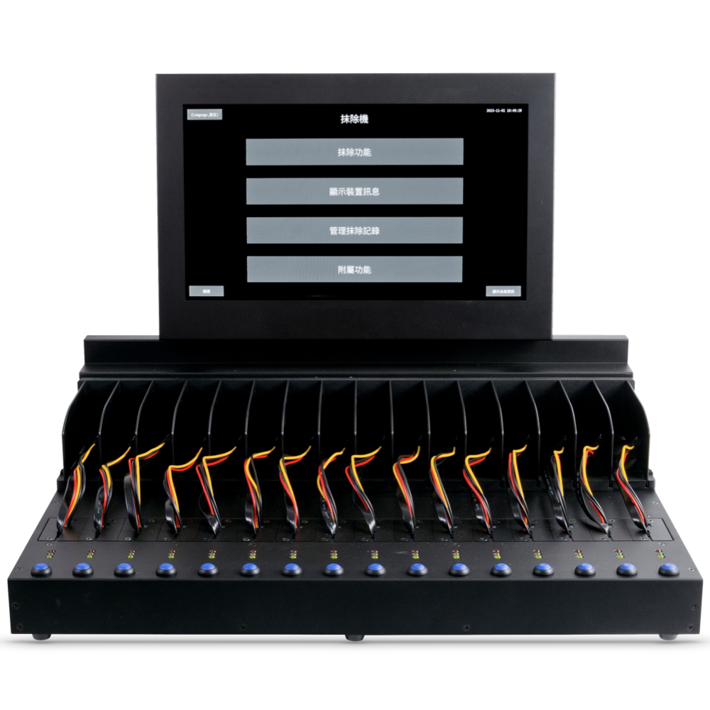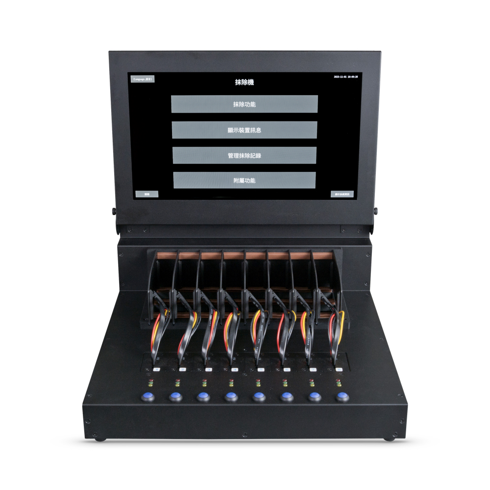 - 觸控大螢幕,清楚呈現硬碟抹除進度以及即時狀況