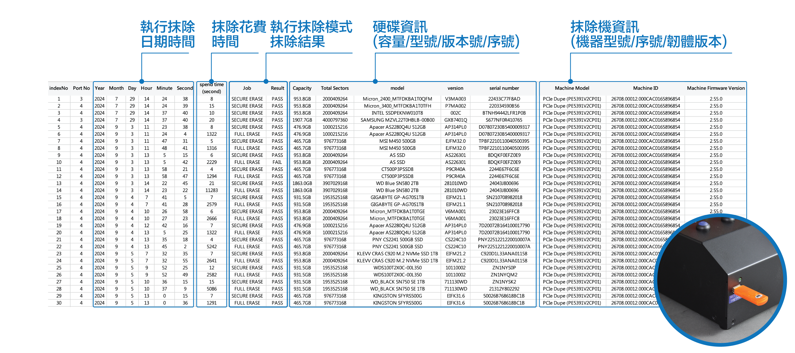 MT400SAS-I 硬碟抹除機可單機儲存 30,000 筆硬碟抹除工作記錄,詳細記錄每一顆硬碟資訊及抹除工作。可使用隨身碟輸出抹除工作記錄。