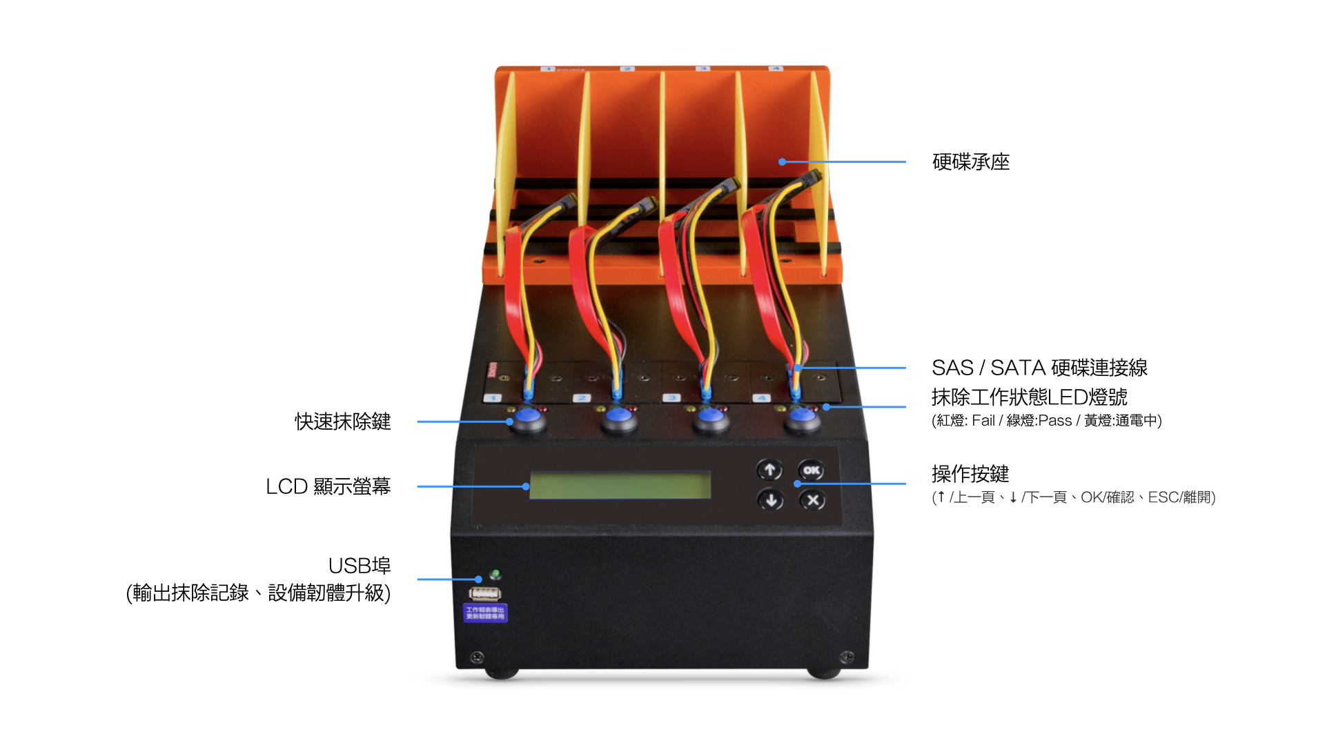 - 可抹除 2.5"/ 3.5"SAS 和 SATA 硬碟、IDE硬碟及SSD固態硬碟