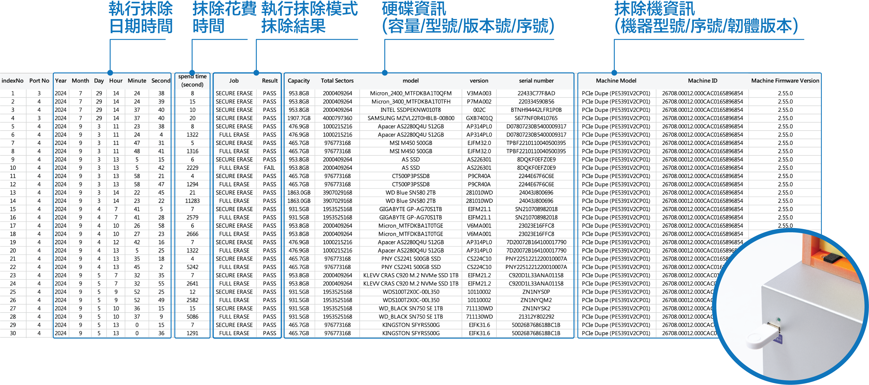 MT1600H-I 硬碟抹除機可單機儲存 30,000 筆硬碟抹除工作記錄,詳細記錄每一顆硬碟資訊及抹除工作。可使用隨身碟輸出抹除工作記錄。