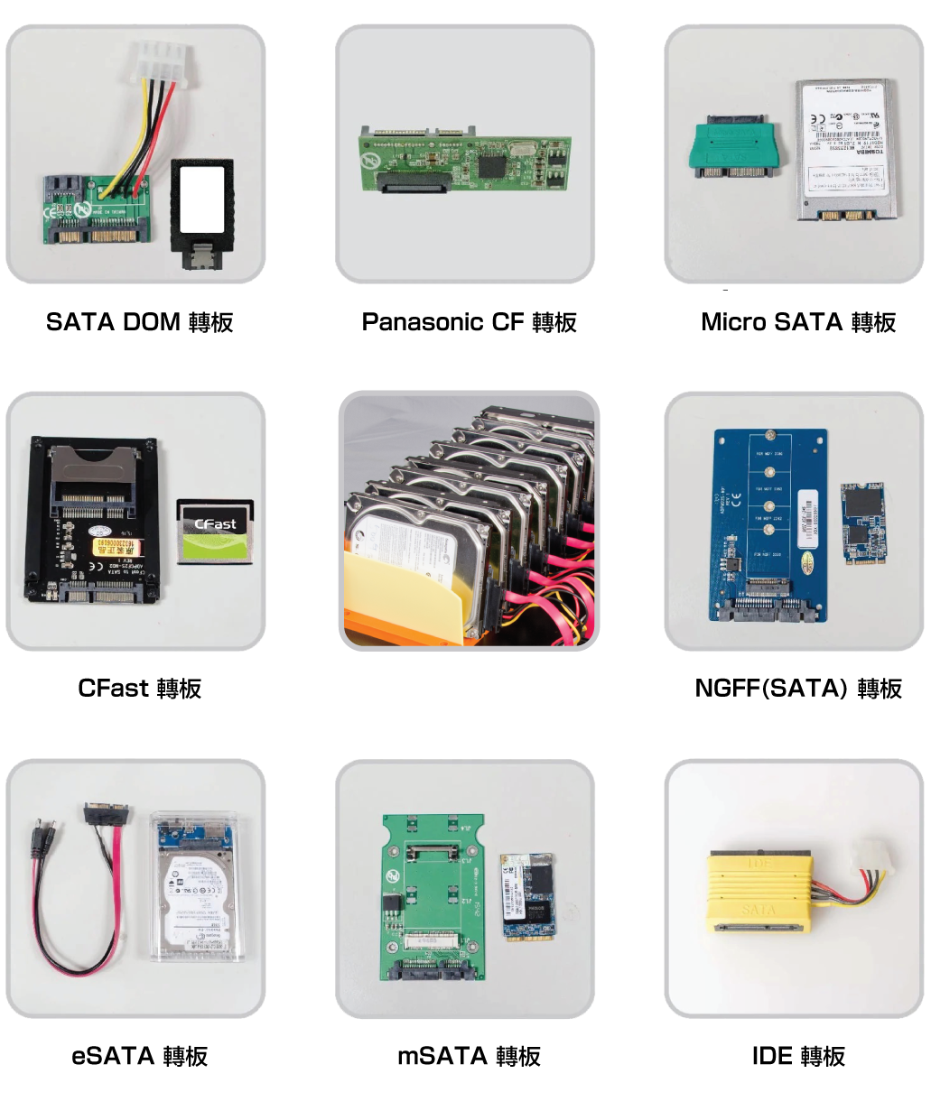 | 相容轉板 | IDE、mSATA、microSATA、eSATA、CFast、NGFF (SATA M.2) |