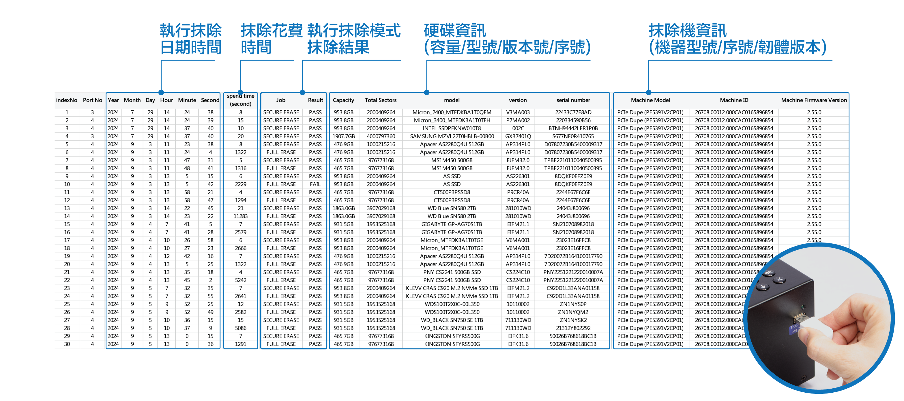 MT800H-I 硬碟抹除機可單機儲存 30,000 筆硬碟抹除工作記錄,詳細記錄每一顆硬碟資訊及抹除工作。可使用隨身碟輸出抹除工作記錄。