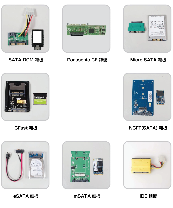 - 硬碟插拔容易且簡單,透過轉版可支援 mSATA、IDE、CFast、CF、SATA DOM等儲存媒體